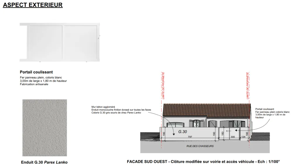 Création d’une dalle béton accueillant 2 places de stationnement. Rehaussement du mur de clôture à 1,90m et pose d’un portail coulissant blanc plein de 3m de large.