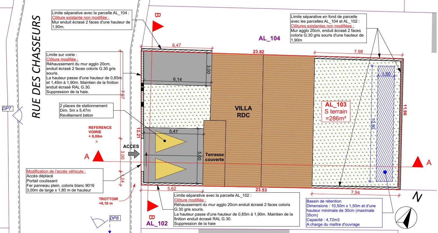 Mais qui dit « dalle en béton » dit « imperméabilisation des sols ». Pour valider le projet en mairie, il a fallu concevoir et intégrer aux plans un bassin de rétention des eaux pluviales de 4,7 m³ en limite de propriété, permettant de compenser l’artificialisation de l’aire de stationnement. Une preuve concrète que même les « petits » travaux nécessitent une maîtrise globale de l’urbanisme.